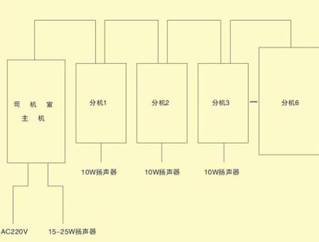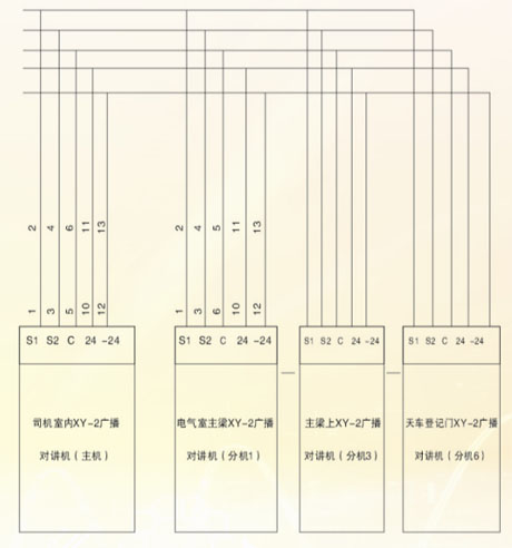 XY―2型系列產(chǎn)品廣泛應(yīng)用于冶金、電力等行業(yè)的有線對講系統(tǒng),在天車上其主站安裝在司機(jī)室,分站可以分布在電力室內(nèi)、高壓室、大小車上和天車登機(jī)門。該系統(tǒng)由若干臺廣播對講機(jī)組成一個(gè)機(jī)內(nèi)通訊網(wǎng)絡(luò),各個(gè)有線廣播站內(nèi)置揚(yáng)聲器和送受話器,任何一個(gè)廣播站喊話,其余話站均能接通廣播?梢允股a(chǎn)人員方便地與天車操作人員取得聯(lián)系。在各個(gè)站操作時(shí)無需撥號,可以方便的實(shí)現(xiàn)一對一講話,各話站并列接線,用戶可根據(jù)工藝要求任意擴(kuò)充,每個(gè)話站都是一個(gè)獨(dú)特的系統(tǒng),任一臺損壞,不會(huì)影響其余分站正常工作。在起重設(shè)備上可以方便地實(shí)現(xiàn)上下車聯(lián)系,機(jī)內(nèi)操作人員相互通訊。接線原理框圖參見附錄。